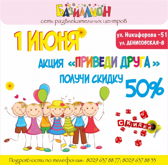 Дорогие наши друзья! Практически каждый день мы видим как кто-то из вас приводит к нам своих друзей, коллег или знакомых. Это нас очень радует. Поэтому мы стремимся поощрять лояльность наших любимых клиентов.1 июня приведи 3-х друзей и получайте скидку в 50%. (вы и ваши друзья!!)